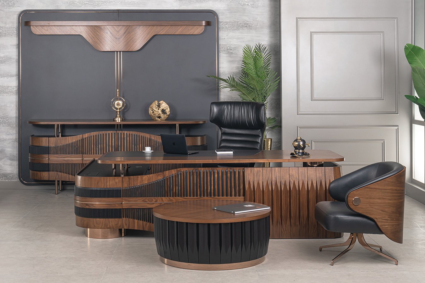 Soprano Ahşap Modern Makam Takımı, ofisinizin ambiyansını zenginleştirerek, modern ve sofistike bir çalışma alanı sunar. Takımın merkezinde yer alan makam masası, akıcı kıvrımları ve masanın ön yüzeyindeki zarif yivli detaylarıyla dikkat çeker.Soprano Ahşap Modern Makam Takımı Masko'da Modern Koltuk Takımları satan firmalardan Teknik Ofis Mobilyaları firmasının bir ürünüdür.