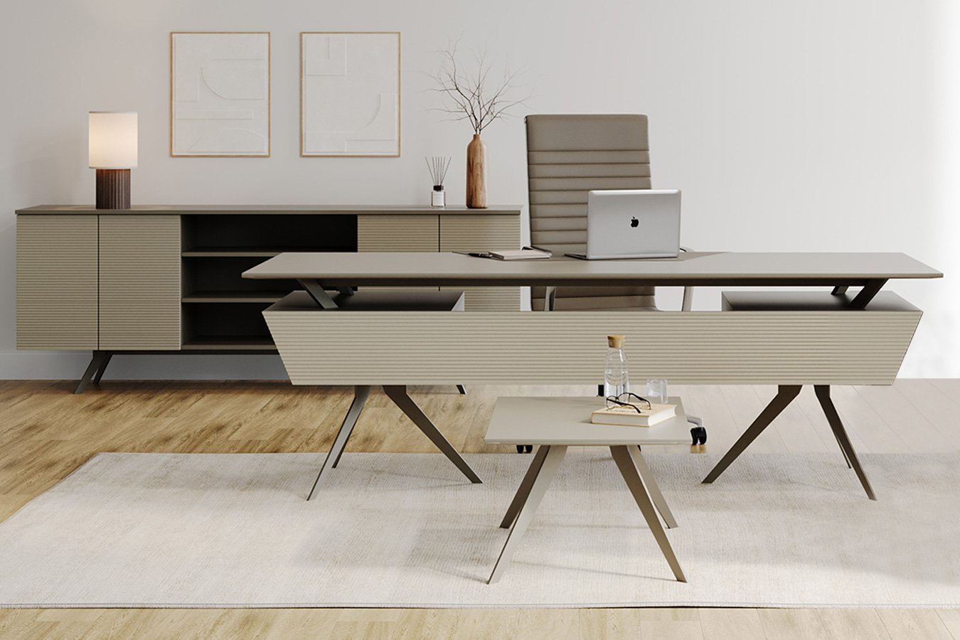 Stark Sail Profil Yönetici Takımı, masa, dolap, etajer ve sehpadan oluşan dört parçalık yapısıyla yönetici odaları için bütüncül bir ofis çözümü sunar. Metal ayaklı tasarımı modern ve güçlü bir duruş kazandırırken, masanın ön panelinde ve dolap ile etajer kapaklarında kullanılan membran yüzeyler takıma estetik bir karakter katar.Stark Sail Profil Yönetici Takımı Masko'da Modern Koltuk Takımları satan firmalardan Teknik Ofis Mobilyaları firmasının bir ürünüdür.